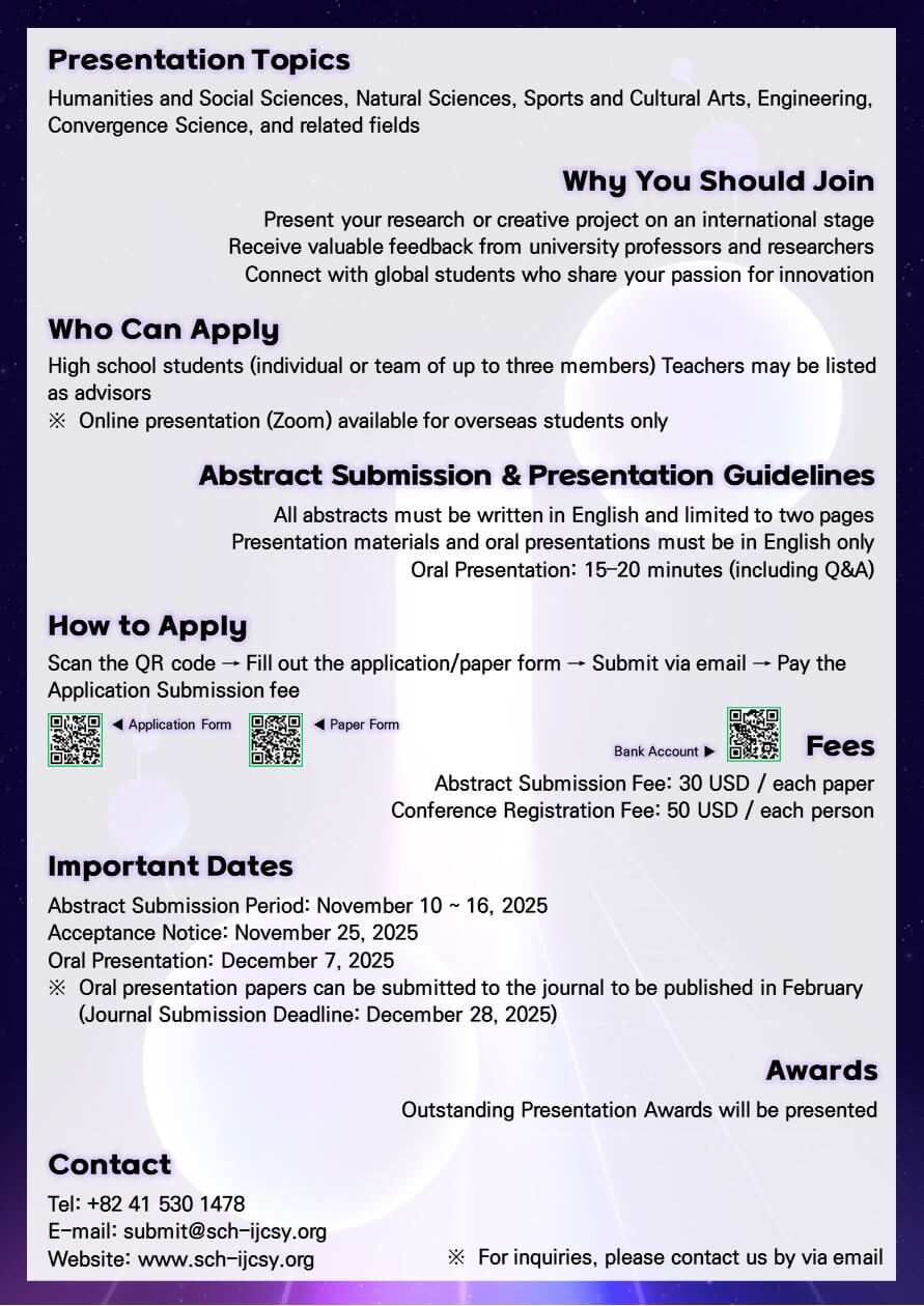 International Journal of Convergence Science for Youth (IJCSY) provides a platform for high school students worldwide to publish interdisciplinary research and develop creative thinking through academic excellence.